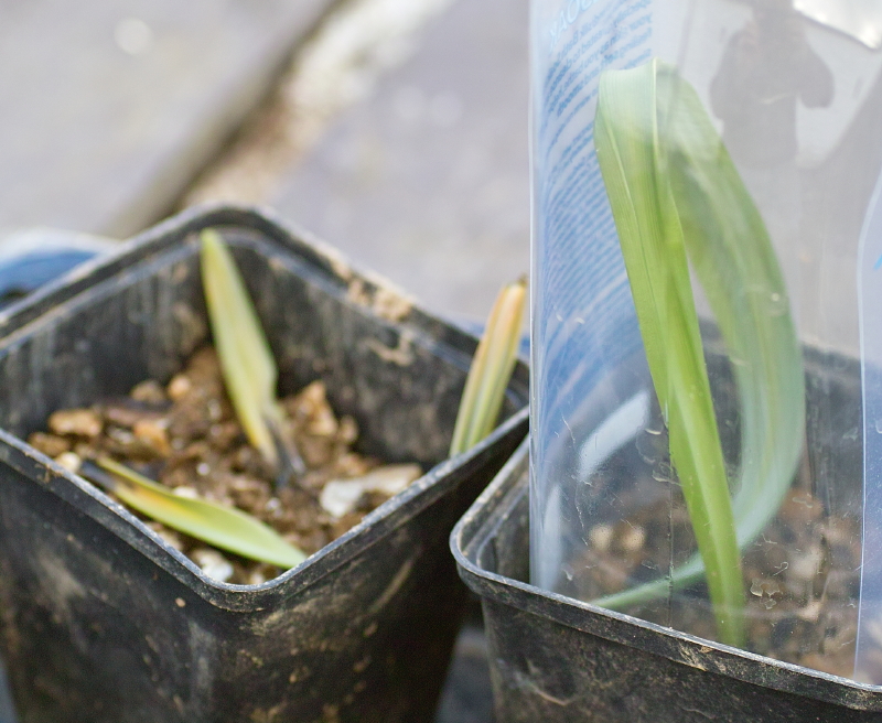 Finally, on the theme of snowdrop propagation you may recall my earlier comments in a post on trying leaf cuttings from a ‘Trym’ like snowdrop, from the two leaves inadvertently pulled off a deeply planted bulb. Last night it occurred to me that there’s a probable link between the snowdrop’s ability to produce multiple rooted bulb like swellings along the ‘stem’ of leaves from a deeply planted bulb and its potential to root from a leaf cutting. As you can see from the image below, one of the leaf cuttings is still going strong, and looking healthy over 4 and a half weeks after it was unceremoniously ripped from it’s bulb base. The other 2 cuttings grew well for over 2 weeks and then rotted at the base.