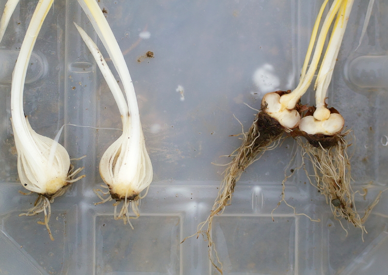 So the poisonous snowdrop bulb is capable of moving up through the soil in this way. Meanwhile the edible (at least as far as many small rodents and squirrels are concerned) Crocus corm seems to be regularly striving to grow deeper into the ground. This seems rational if it is a favoured food of many animals, and because in the case of a corm like a Crocus, the main part of the corm is the swollen stem base, and each year the old stem base produces the leaves and flower, and then at the end of the growing season a new corm which sits on top of the old one. (See above) So Crocus will naturally tend to grow higher in the soil. The Crocus counteracts this by having the ability to produce thick conical contractile roots. These fill with starch during the growing season, then this starch gets transferred to the newly formed corm, and so the root shrinks, pulling the newly formed corm deeper down into the soil. (New cormlets can also be formed at the corm’s base which have contractile roots as well). You can see how different these contractile roots are to the fine fibrous roots of a more mature corm.